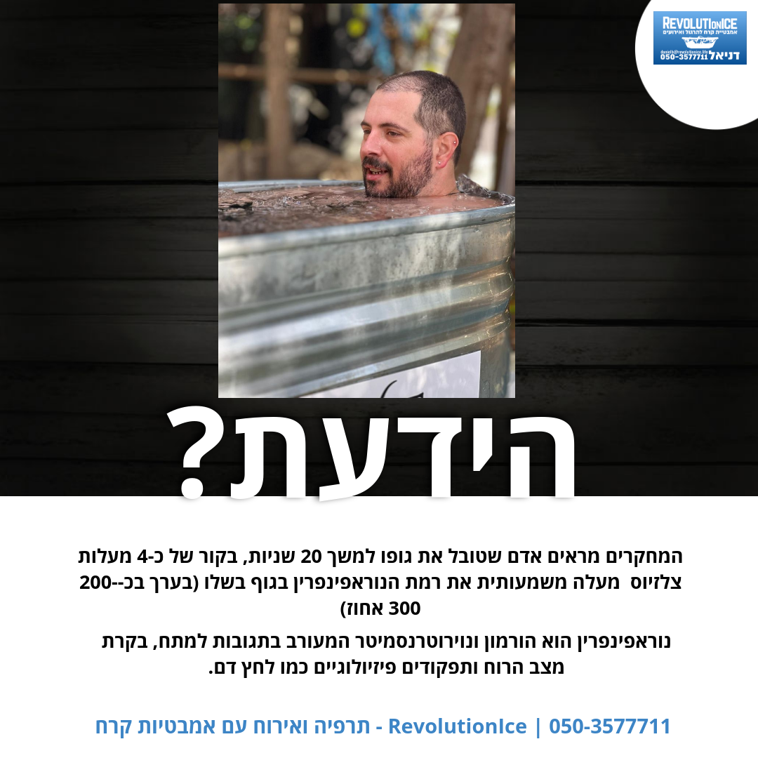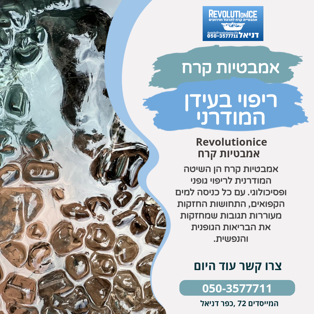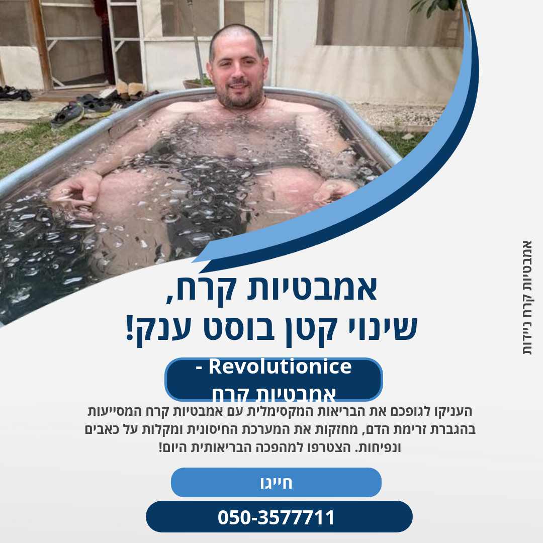 "הטיפול באמבטיה קרח היה מדהים ואני ממליץ בחום! תחושת רעננות ואנרגיה מחודשת, הרגשתי שיפור במצב הרוח והחוזק המנטלי. הליווי המקצועי והאווירה המיוחדת עשו את כל ההבדל.